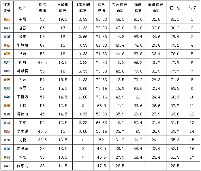 泰州消防救援支隊2021年公開招聘文員 人員筆試面試成績及總成績公告