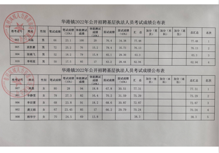 華港鎮2022年公開招聘基層執法人員考試成績表