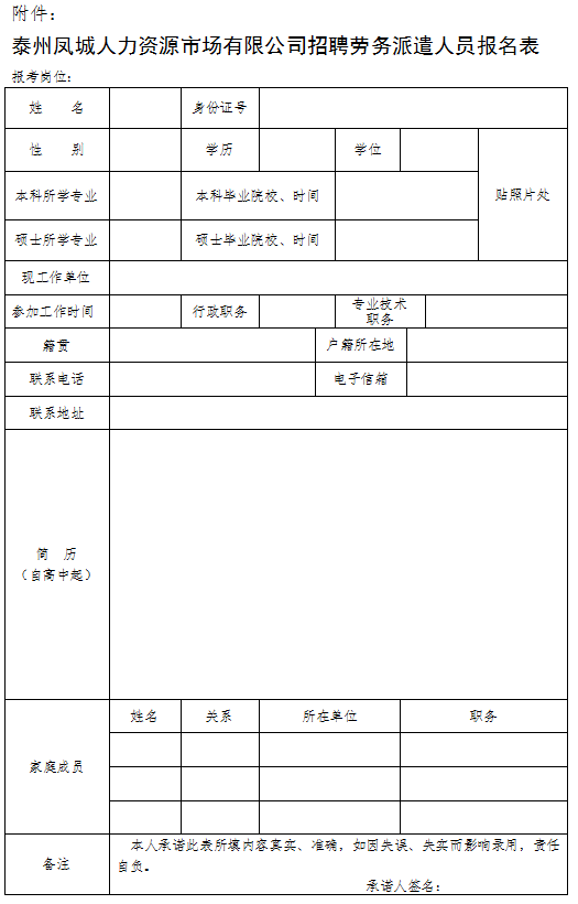 泰州鳳城人力資源市場有限公司招聘勞務(wù)派遣人員報名表 點此下載