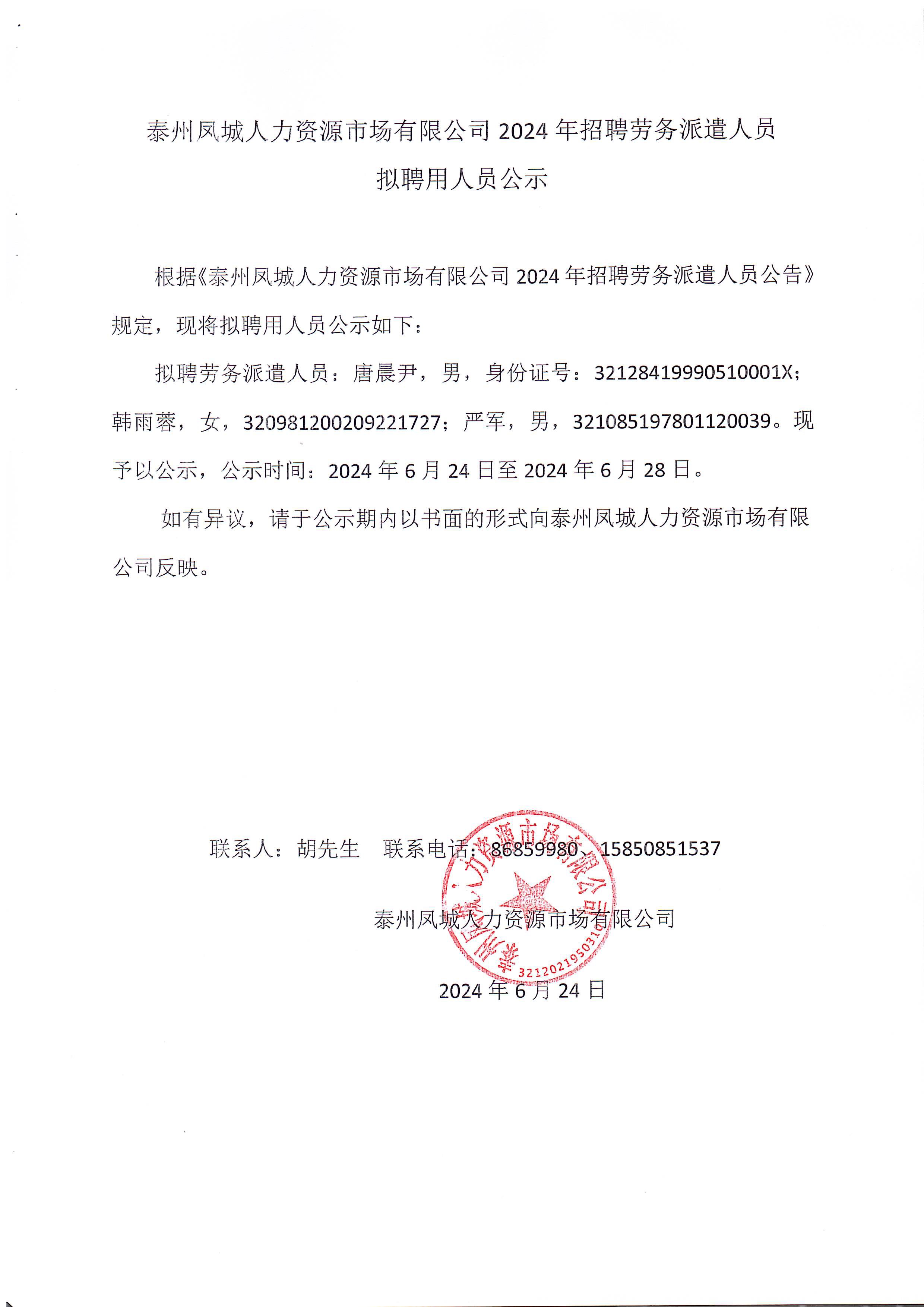 泰州鳳城人力資源市場有限公司2024年招聘勞務派遣人員 擬聘用人員公示