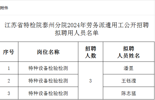 江蘇省特檢院泰州分院2024年勞務(wù)派遣用工公開(kāi)招聘擬錄用名單公示